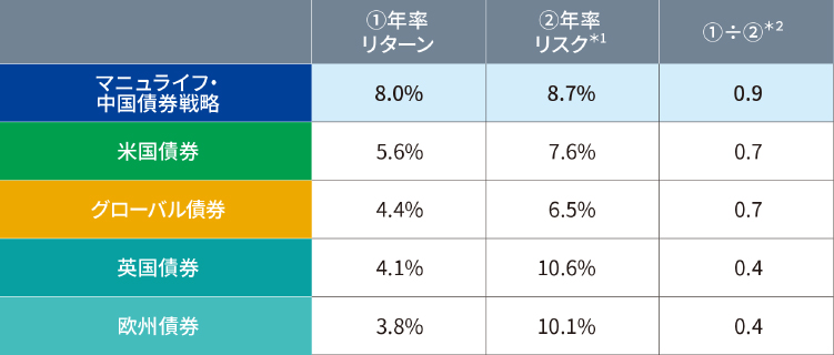※中国債券 : ブルームバーグ中国総合債券指数(トータルリターン、人民元ベース)、米国債券 : ブルームバーグ米国総合債券指数(トータルリターン、 米ドルベース)、日本債券 : ブルームバーグ日本総合債券指数(トータルリターン、円ベース)、グローバル債券 : ブルームバーグ・グローバル総合債券指数(トータルリターン、米ドルベース)、欧州債券 : ブルームバーグ欧州総合債券指数(トータルリターン、ユーロベース)